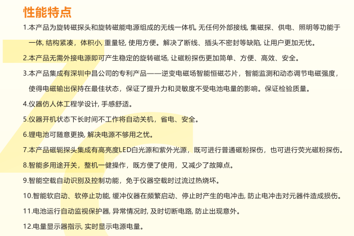本磁探仪是单体多功能, 充好电后, 可完成所有磁粉探伤工作